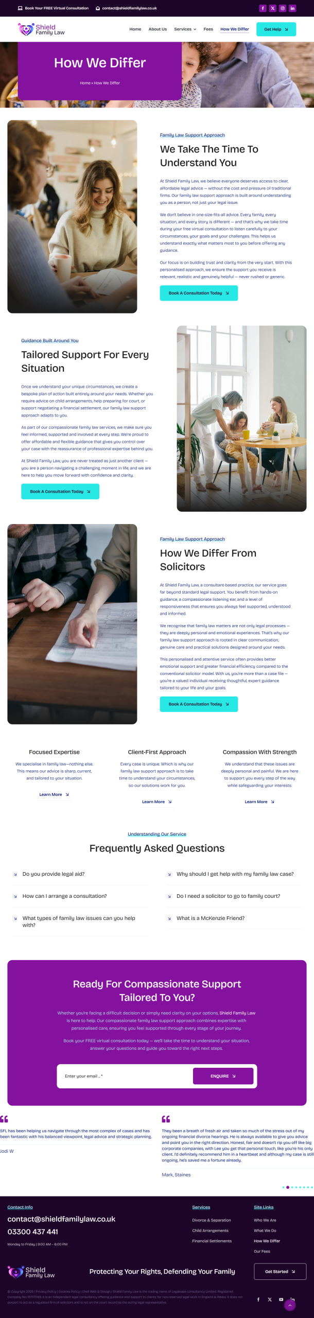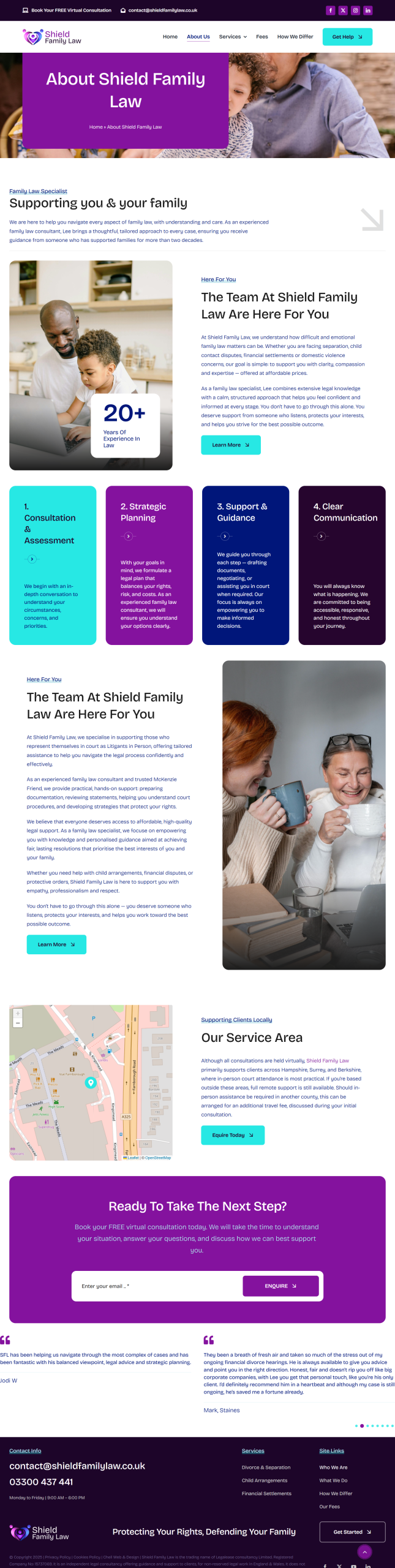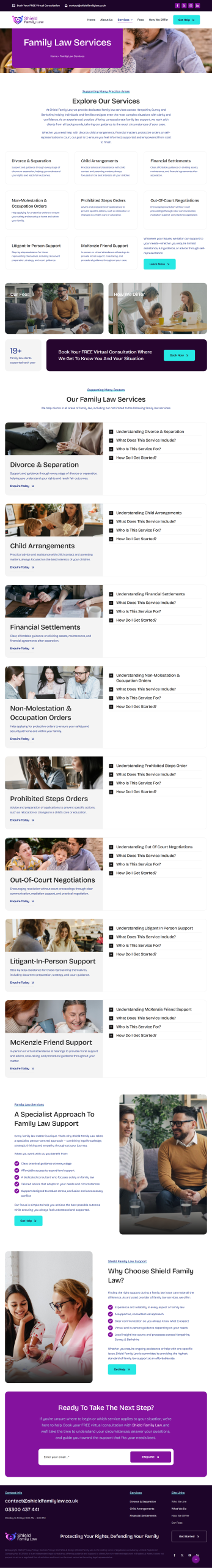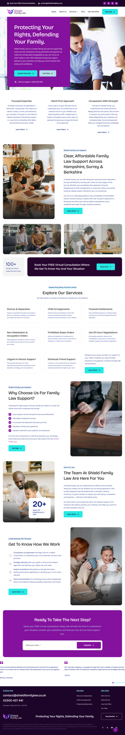 Conclusion: The new Shield Family Law website successfully combines professionalism with warmth, reflecting the firm’s values and approach. With its clean design, engaging colour palette, and clear calls to action, the site provides a trustworthy, approachable, and user-friendly experience, perfectly suited for clients seeking